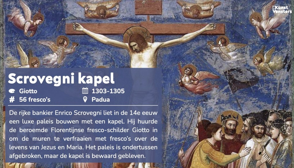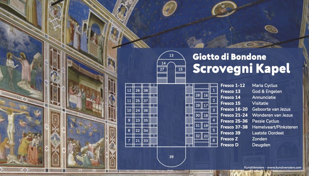 De fresco’s van Giotto in de Scrovegni-kapel lezen als een stripverhaal. In 27 panelen zijn de levens van Joachim, Maria en Jezus afgebeeld. Giotto was zijn tijd vooruit. Naast de statische portretten van Byzantijnse kunstenaars, zijn de figuren van Giotto levensecht. Hij gebruikte een primitieve vorm van perspectief, liet personen bewegen, gaf kleren schaduwen en toonde emoties. Giotto wordt daarom vaak gezien als de kunstenaar die de Renaissance op gang bracht.
