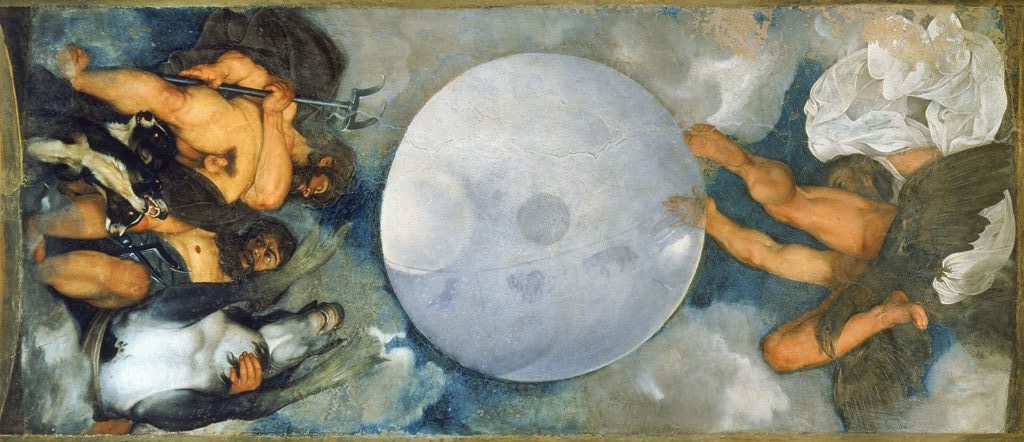 In de plafondschildering van Caravaggio zie je de godenwereld van onderen. En zo kijk je recht in het kruis van Pluto, god van de onderwereld met de driekoppige hond Cerberus. Ook schilderde Caravaggio oppergod Jupiter met de adelaar en Neptunus met een paard. Latere eigenaren vonden de naakte Pluto niets en schilderden het plafond helemaal wit. Pas in de jaren 80 is het werk teruggevonden.
