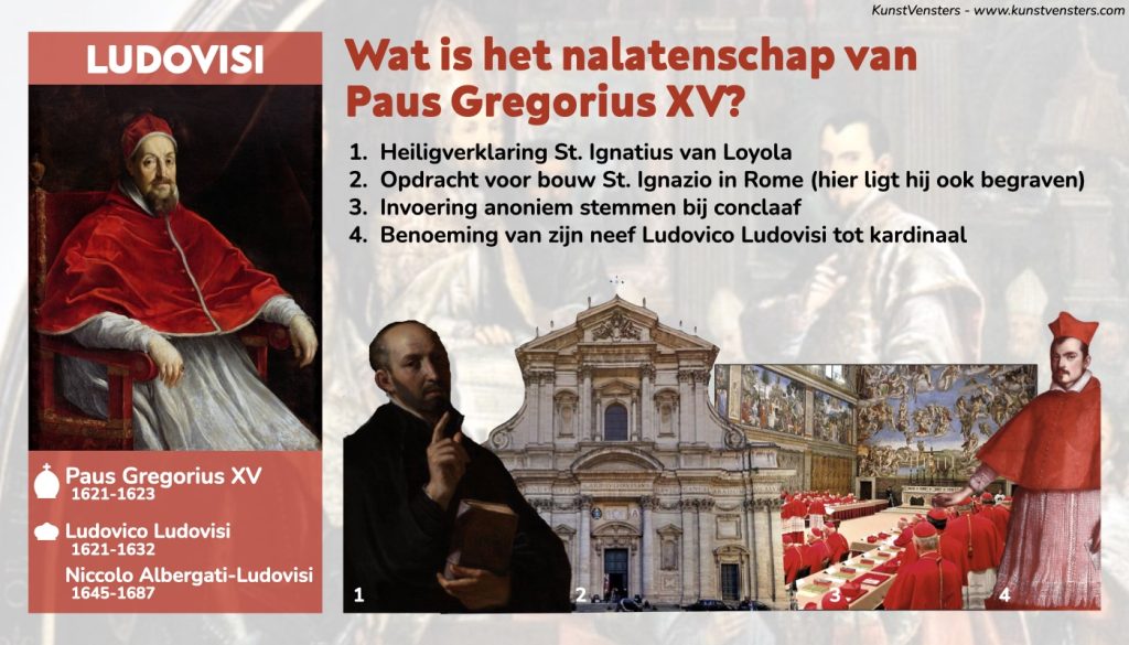 Hoewel Paus Gregorius XV maar twee jaar aan de macht was, is het nalatenschap van de Ludovisi familie nauwelijks te overschatten. Paus Gregorius verklaarde St. Ignatius van Loyola heilig. Hij zorgde zo voor verdere erkenning van de Jezuïeten. Paus Gregorius en Ludovico Ludovisi liggen daarom ook begrafen in de St Ignatius, één van de belangrijkste Jezuïetenkerken in Rome.