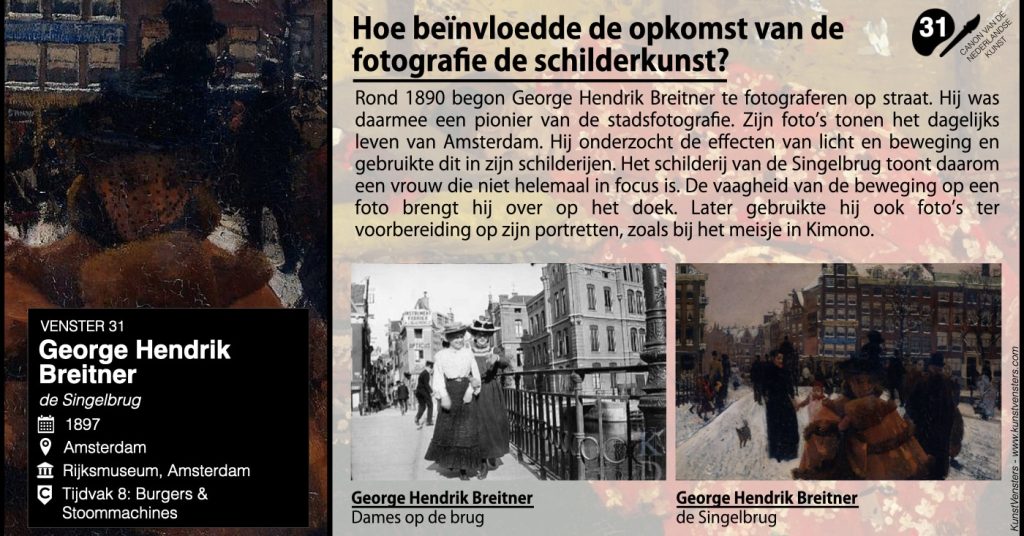Breitner’s beroemde schilderij van de Singelbrug (boven dit artikel) lijkt direct op een foto geïnspireerd. Een vrouw komt recht op ons afgelopen. Als Breitner in de openlucht geschilderd zou hebben, zou de vrouw enorm dicht op de schildersezel moeten staan. Het schilderij lijkt niet helemaal in focus is. Hij brengt zo de illusie van beweging over op het doek.