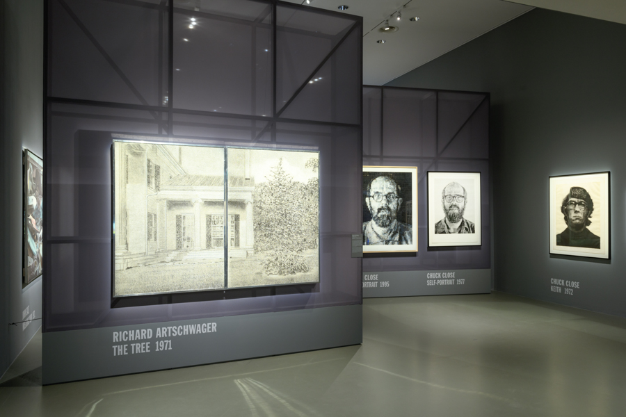 De oude zelfportretten van Chuck Close lijken net pasfoto’s. Close kijkt recht in de camera, haar een beetje door de war, weerspiegeling van de flits in zijn bril. Deze fotografische benadering is ook goed te zien in een schilderij van twee cowboys, dat wel overbelicht lijkt. Het is alsof de werkelijkheid direct op het doek is vastgelegd.