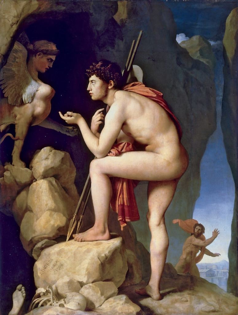 Moreau lijkt de compositie van Ingres te hebben overgenomen. Hij schilderde het moment vlak voor het antwoord. De sfinx hangt al om Oedipus heen, klaar om hem te grijpen als hij het verkeerde antwoord geeft. Maar Moreau gaat een stap verder dan Ingres en verstopt allerlei extra verwijzingen in het schilderij. Achter Oedipus staat een laurierboom, gewijd aan Apollo als symbool van eer. Denk bijvoorbeeld aan de lauwerkransen, die winnaars van sportwedstrijden krijgen omgehangen. Achter de sfinx staat juist een vijgenboom, een traditioneel symbool van zonde. De mogelijke dood van Oedipus wordt gesymboliseerd door de urn en de slang.