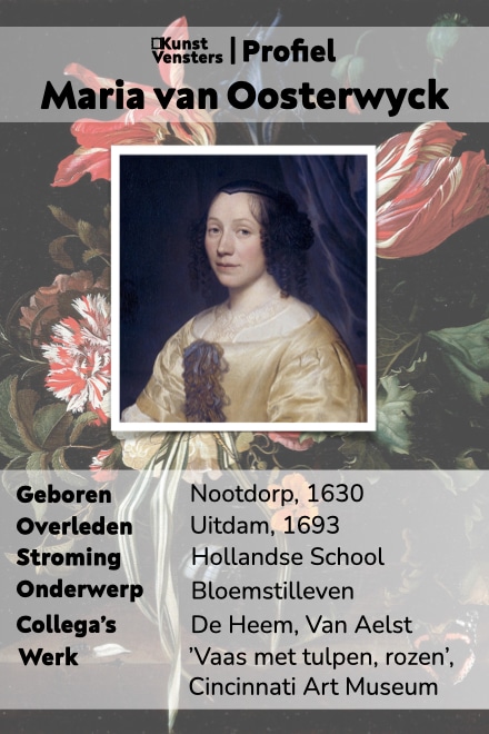 De bloemstillevens van Maria van Oosterwyck worden gekenmerkt door een sterk symbolische lading en een verfijnde techniek. Ze schilderde vaak vanitas-elementen zoals zandlopers of schedels tussen de bloemen, verwijzend naar de vergankelijkheid van het leven. Van Oosterwyck werd geroemd om haar vermogen om verschillende texturen weer te geven, van de zachte petalen van rozen tot de glanzende oppervlakken van glazen vazen.