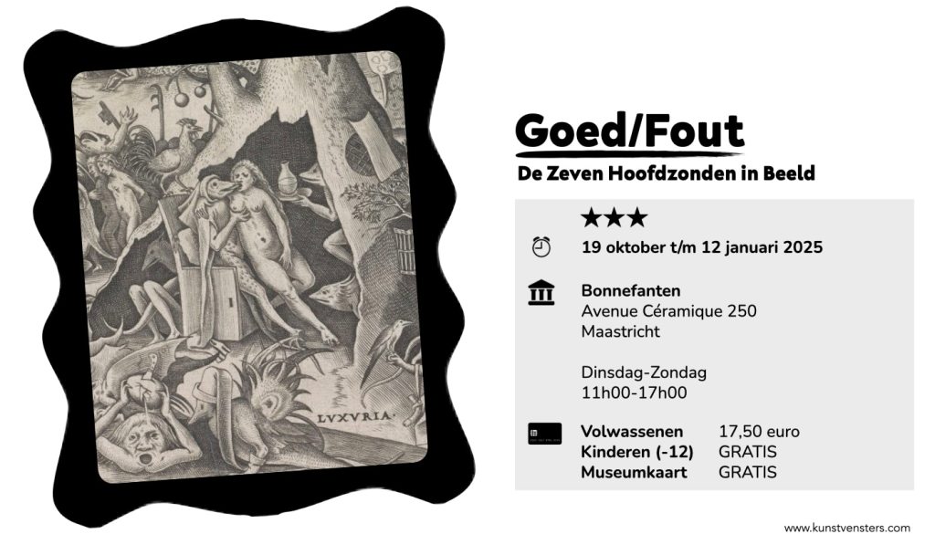 In de tentoonstelling “Goed/Fout” in het Bonnefanten ontdekken bezoekers de zeven hoofdzonden in de wereld van Brueghel en Bosch. De tentoonstelling nodigt de bezoekers uit om hun eigen ‘hoofdzonde’ te kiezen.