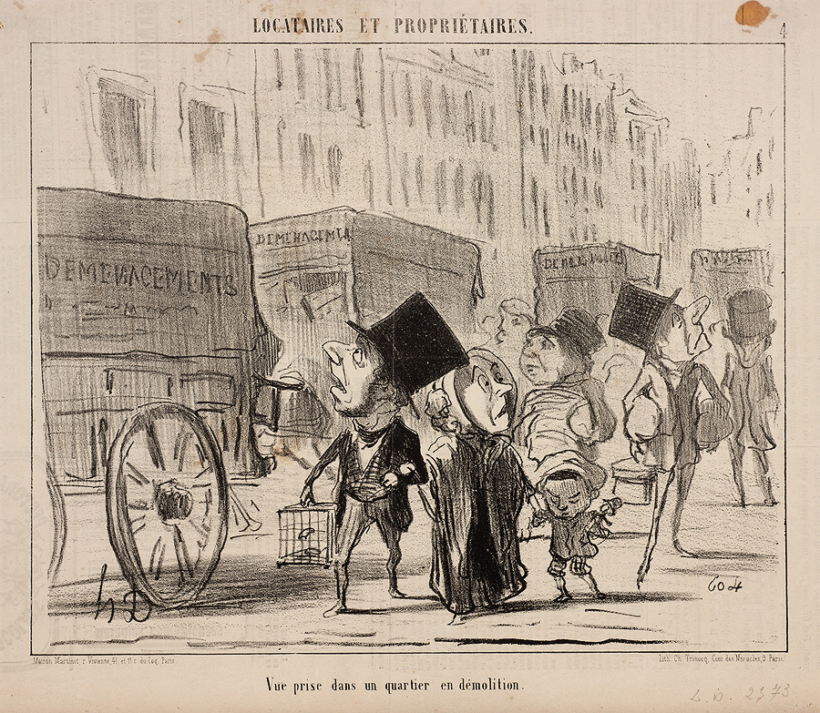 De pijnlijke gevolgen zijn ook onderwerp van de spotprenten van Honoré Daumier. In de tekeningen zien we ontheemde Parijzenaars slapen in pissoirs en regentonnen. Ook de stijgende huurprijzen neemt hij op de korrel. De kamertjes zijn zo klein dat een man er zelfs geen hoed kan dragen. Daumier laat met zijn tekeningen de sociale gevolgen zien, die de impressionisten in hun schilderijen negeerden.