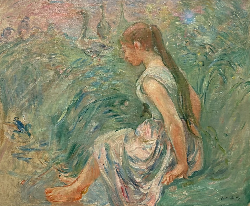 De meest losse penseelstreek van de tentoonstelling is te vinden in het werk van Berthe Morisot. Waar de mannelijke impressionisten de cafés en cabarets schilderden, zien we in haar schilderijen het leven van de vrouw. Haar schilderijen van jonge vrouwen tussen de ganzen in het park laten zien dat ze tot grootste vernieuwers van het impressionisme behoort. De schaduwen van de planten aan de waterkant geven de witte jurk van de vrouw een groene gloed. Haar trefzekere toets en heldere kleuren geven olieverf de uitstraling van pastelkrijt.