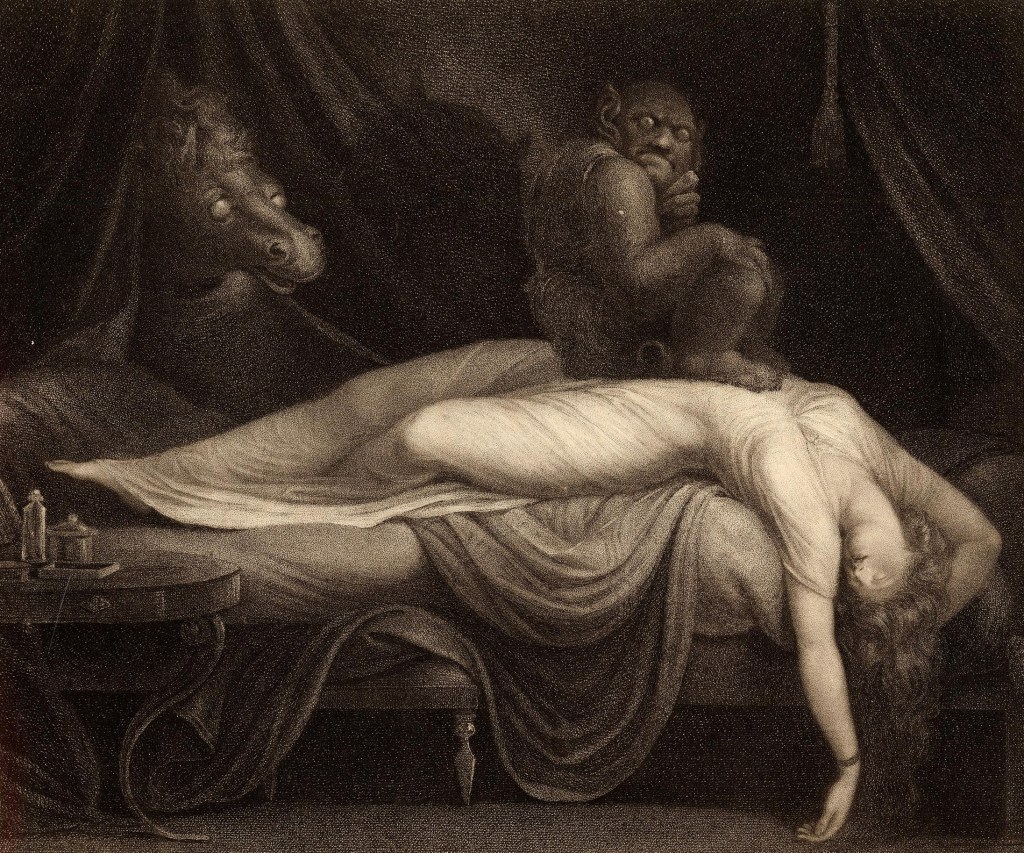 Volgens sommige kunsthistorici moet Johann Heinrich Füssli geprobeerd hebben om een slaapverlamming te schilderen. Op het doek ligt een vrouw in een witte jurk languit op een bed. De gestrekte armen kan ze niet bewegen. Op haar zit een monster, een hallucinatie. Het paard, een merrie, verwijst naar de titel van het schilderij: De Nachtmerrie. In de 18e eeuw omschreef men een merrie als ‘een geest die in de heidense mythologie in verband werd gebracht met kwelling of het verstikken van slapers’.