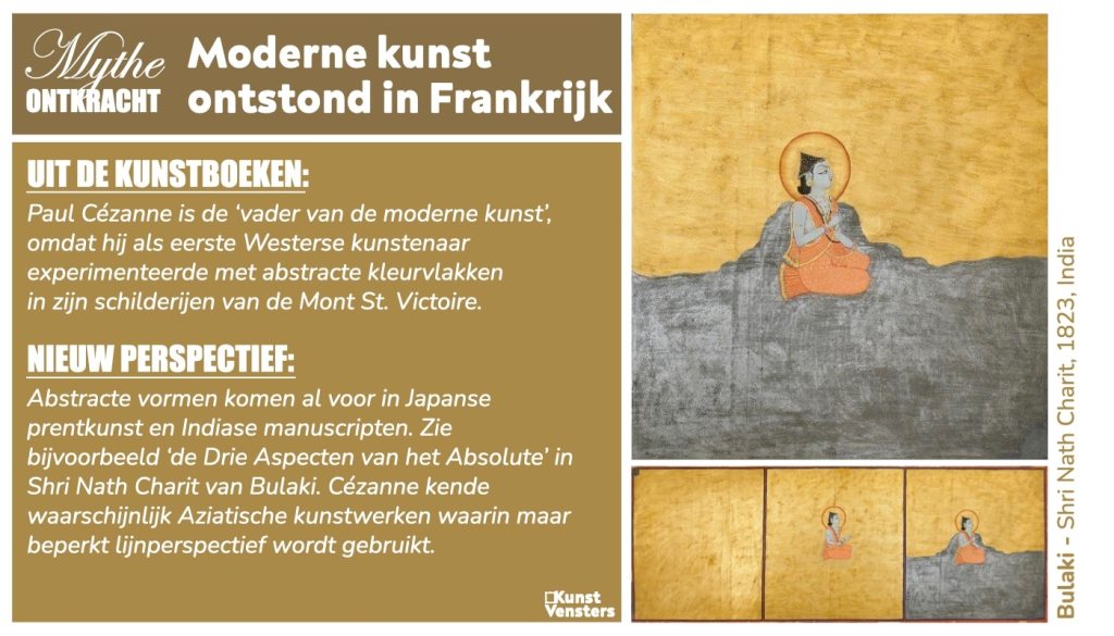 Natuurlijk zijn de stijlen van Hokusai en Cézanne totaal niet vergelijkbaar. Waar in de prenten van Hokusai de lijn dominant is, bouwt Cézanne zijn werken op uit kleur. Toch zijn de Japanse invloeden op zijn schilderijen onmiskenbaar. Mogelijk is het verhaal van het ontstaan van het modernisme dus geen puur Europees verhaal, maar hebben we de moderne kunst – deels – aan Japanse kunstenaars te danken.