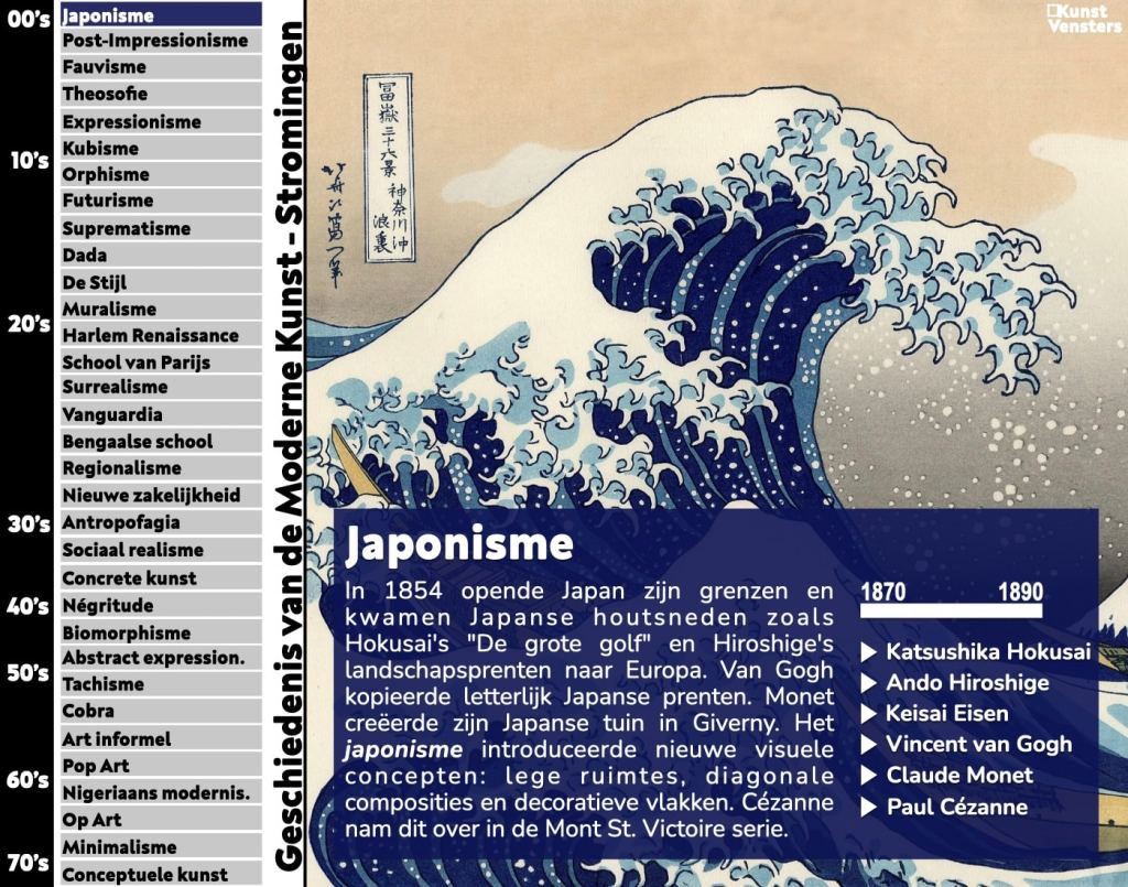 Japan was eeuwenlang afgesloten geweest van de Westerse wereld. Pas in 1853 opende het land zijn grenzen langzaam voor buitenlanders. Hierdoor kwamen Japanse prenten in eind 19e eeuw op grote schaal in omloop in Europa. De nieuwe Japanse kunst zorgde voor een golf van enthousiasme onder kunstenaars. Vincent van Gogh en Claude Monet schilderden doeken op basis van de Japanse kunst. Ook van Paul Cézanne is bekend dat hij een groot liefhebber was van de Japanse kunst.