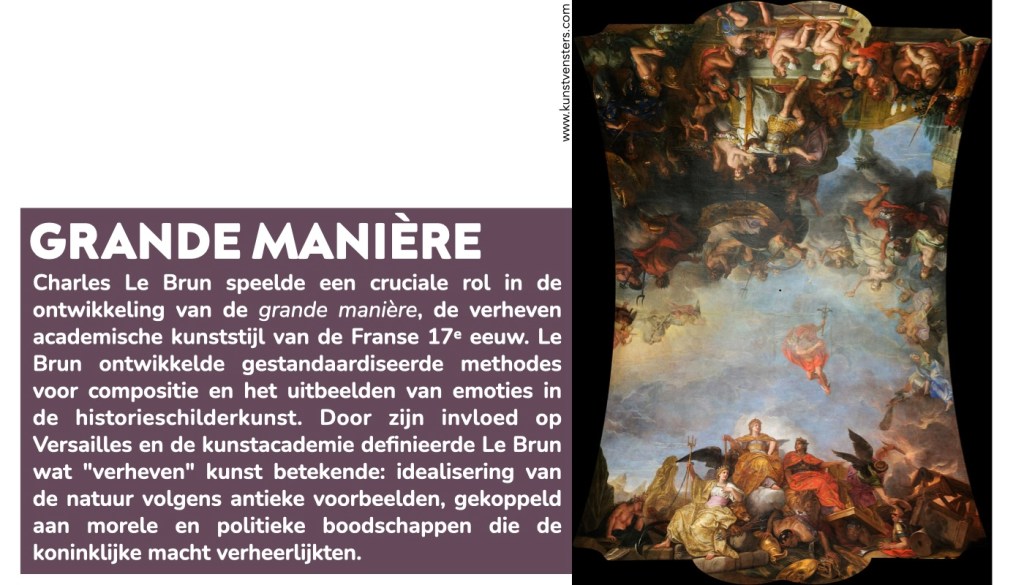 Charles Le Brun bleef nog tientallen jaren werken voor koning Lodewijk XIV. Zijn verheven “grande manière” stijl siert daardoor de paleizen van de koning. In Versailles creëerde Le Brun plafondschilderingen in de beroemde Galerie des Glaces die de militaire overwinningen van de koning verheerlijkten. In de Galerie d’Apollon van het Louvre schilderde hij Apollo’s triomf over de duisternis, waarbij de zonnegod direct verwijst naar de Zonnekoning. Maar deze indrukwekkende schilderingen waren afgesloten van het publiek en alleen te zien voor gasten van de koning. Het is vooral te danken aan de prenten en de tapijten dat het werk van Charles Le Brun verspreid raakte over heel Europa. De Grande Manière zou nog eeuwenlang leidend blijven bij de decoratie van paleizen in heel Europa.