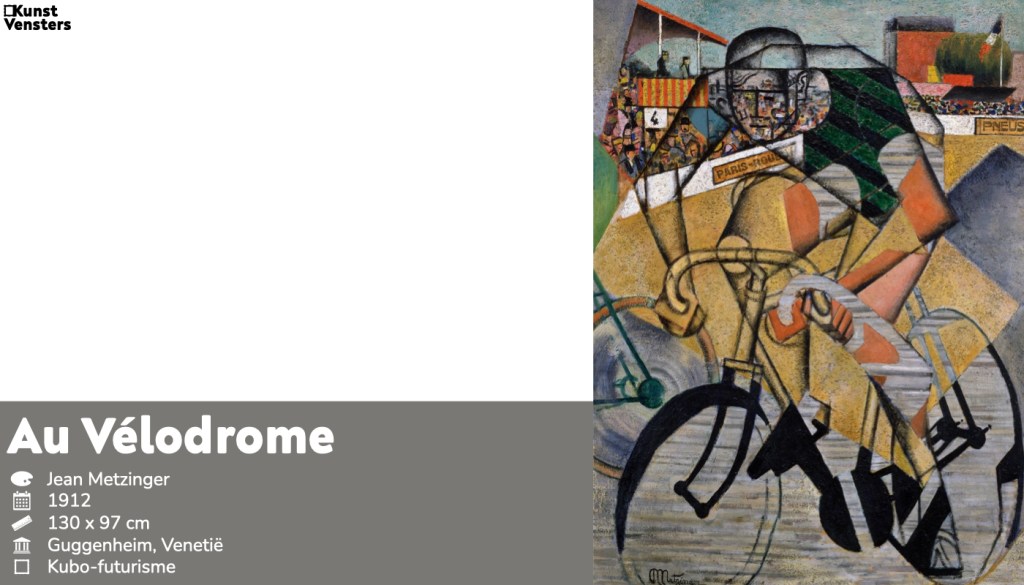 Het is daarom niet verrassend dat Metzinger meerdere schilderijen van wielrenners heeft gemaakt, waarvan “Op de wielerbaan” uit 1912 het beroemdst is. Op het doek staat Charles Crupelandt vlak nadat hij in Roubaix over de finish is gekomen. Op de boarding op de achtergrond is “PARIS-ROUB” te lezen, waardoor we zeker weten dat het om Parijs-Roubaix gaat. Metzinger knipte de tekst letterlijk uit de krant en plakte het in het schilderij, net als de reclame voor PNEUS banden. Het doek is dus een combinatie van een collage met een schilderij.
