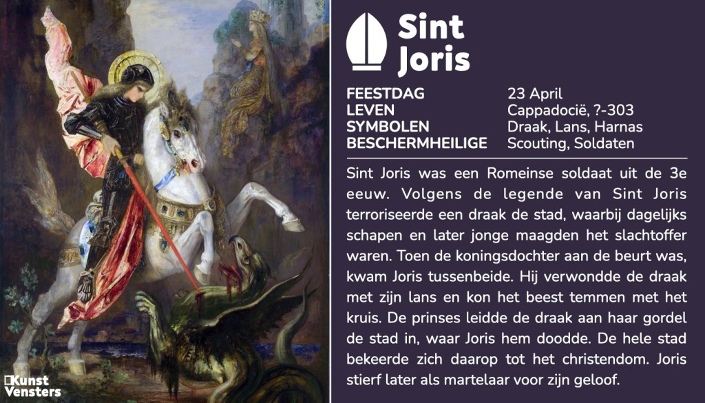 Het verhaal van Sint Joris is een van de spannendste heldenverhalen uit de Legenda Aurea, de Middeleeuwse verzameling heiligenverhalen. In de 11e eeuw zou er in Libië een draak hebben geleefd, die dagelijks een offer vroeg van de dorpelingen. Eerst gaven ze het monster vee. Maar toen dit op was, begonnen ze mensen te offeren. Op een dag was zelfs de prinses aan de beurt. Treurend over haar lot werd ze aangesproken door Joris. De prinses vertelde hem over de draak en raadde hem aan onmiddellijk te vluchten. Maar Joris ging het gevecht aan met de draak. Na een strijd doodde hij de draak en redde de prinses. Onder de indruk van de christelijke Sint Joris bekeerden de dorpelingen zich massaal tot het christendom.