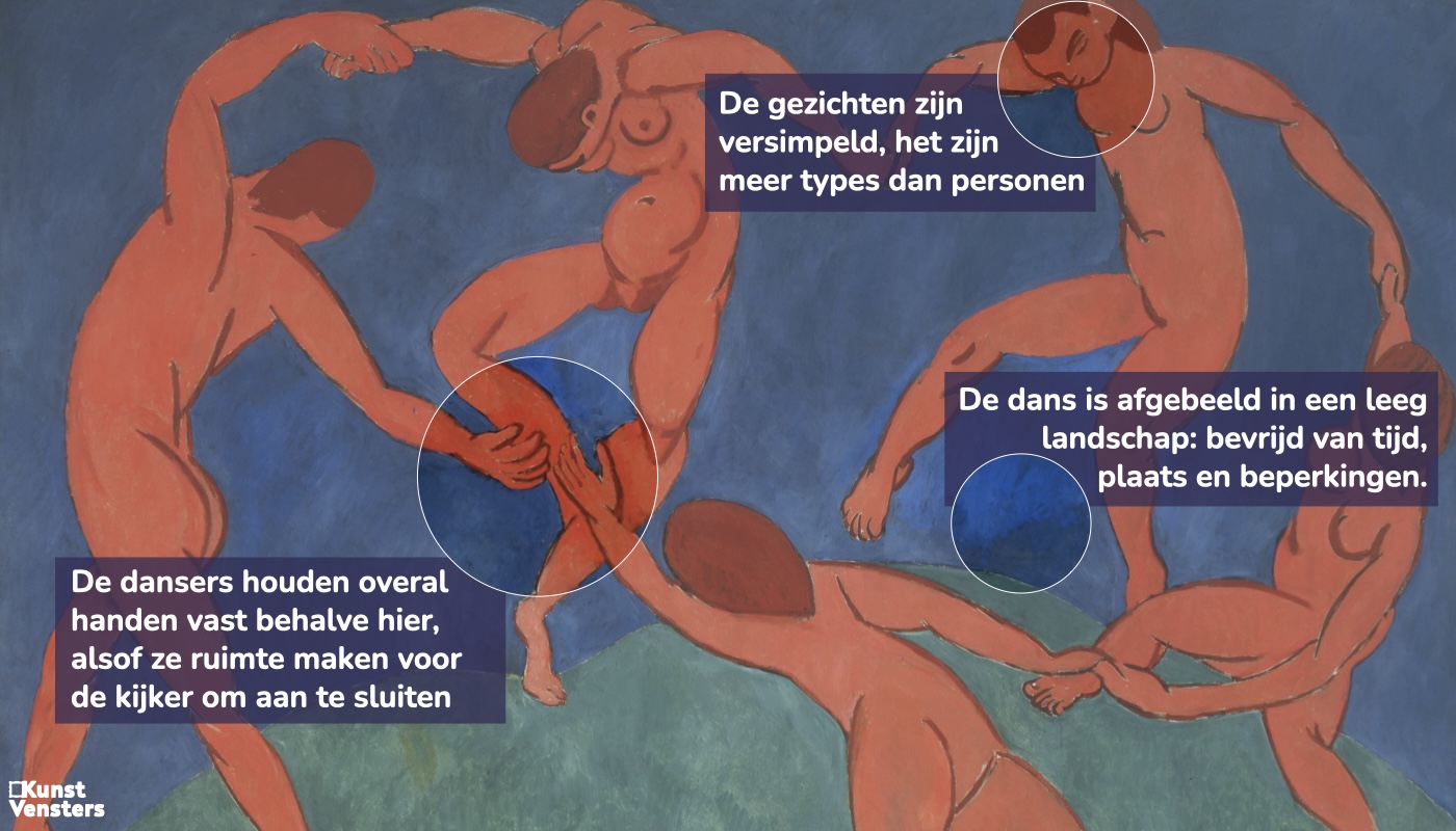 Henri Matisse schilderde La Danse in 1910, op het hoogtepunt van zijn fauvist oeuvre. Het fauvisme, dat rond 1905 ontstond, kenmerkt zich door ongemengde, explosieve kleuren en een loslating van de naturalistische werkelijkheid. De vijf dansende figuren zijn geschilderd in een vurig oranje-rood, afgetekend tegen een fel blauw en een helder groen. Matisse kiest bewust voor platte kleurvlakken zonder schaduwen of perspectief — een directe uiting van de fauvist overtuiging dat kleur op zichzelf expressieve kracht draagt, los van de werkelijkheid.